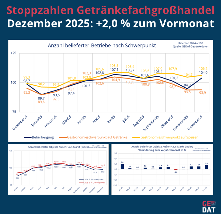 Der GFGH im Außer-Haus-Markt verzeichnet im Dezember 2025 einen Indexwert von 101,6. Bezugsgröße ist das Gesamtjahr 2024 mit einem Index = 100.