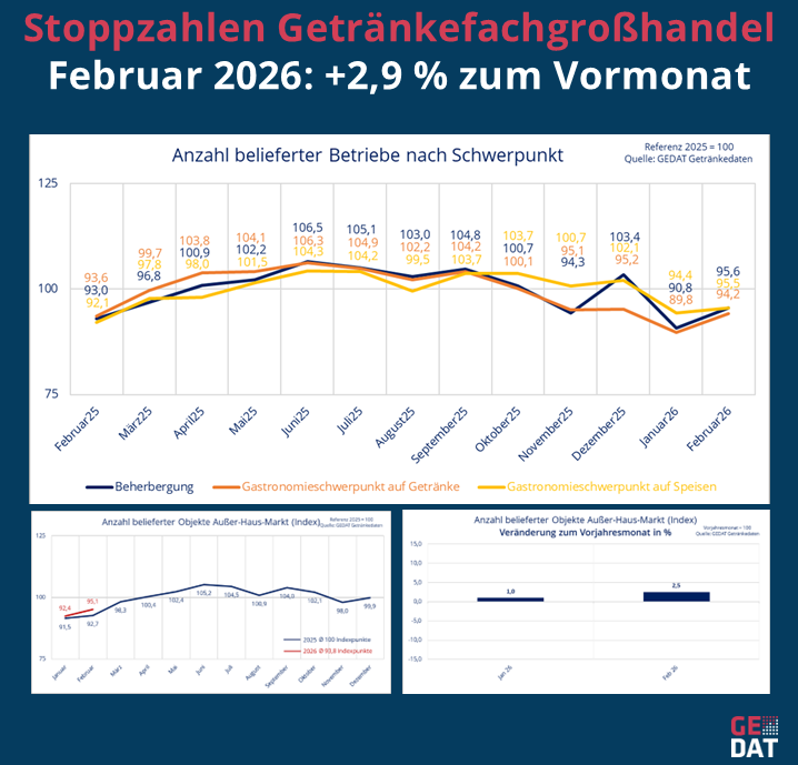 Der GFGH im Außer-Haus-Markt verzeichnet im Februar 2026 einen Indexwert von 95,1. Bezugsgröße ist das Gesamtjahr 2025 mit einem Index = 100.