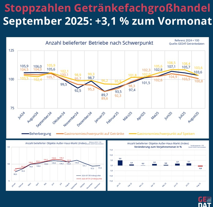 Der Getränkefachgroßhandel im Außer-Haus-Markt verzeichne demnach im September 2025 einen Indexwert von 105,8. Bezugsgröße ist das Gesamtjahr 2024 mit einem Index = 100.