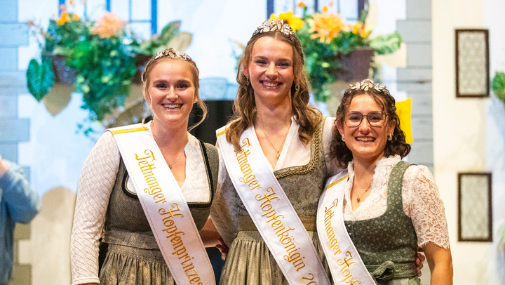 Tettnanger Hopfenkönigin 2025/2027 wird für die nächsten zwei Jahre Irina Müller sein. Ihr zur Seite stehen die Tettnanger Hopfenprinzessinnen 2025/2027 Paulina Mosch und Marianne Müller. Die Insignien – Diadem und Seidenschärpen - wurden durch die Vorgängerinnen an das neue Dreigestirn überreicht. Als Zeichen für den Beginn ihrer Amtszeit durfte das frisch gewählte Dreigestirn einen ersten Fassanstich auf der Bühne durchführen. Dabei stachen die drei neuen Hopfenhoheiten gleich drei Bierfässer der drei Tettnanger Brauereien – der Kronenbrauerei, der Gasthofbrauerei Schöre und des Hopfenguts No. 20 - gleichzeitig an.