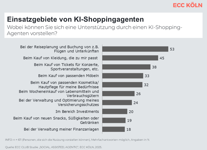 Mit dem sich veränderten Informations- und Einkaufsverhalten beschäftigt sich die neue ECC CLUB Studie „Social, Assisted, Agentic“ des ECC Köln. Für die Studie wurden insgesamt 1.000 Personen repräsentativ nach Alter und Geschlecht über ein Onlinepanel befragt und mit 200 Personen Tiefeninterviews über einen KI-Chatbot durchgeführt.