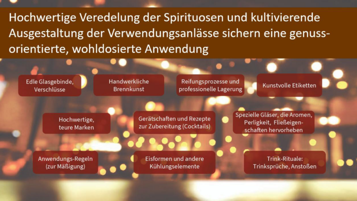 Laut rheingold-Studie verbinden die Konsument:innen mit unterschiedlichen Spirituosen und spirituosenhaltigen Getränken unterschiedliche Anlässe, Stimmungen und Traditionen. Sie legen besonderen Wert auf Qualität und genießen die Produkte bewusst und mit Augenmaß in einem kultivierten, geselligen Rahmen. Genussmomente finden sie in besonderen Anlässen, bei denen sie qualitativ hochwertige Spirituosengetränke schätzen und hierbei vor allem den Genussmoment inszenieren – von edel gestalteten Flaschen über spezielle Gläser, besondere Zubereitungsarten und Rezepte bis hin zu Trink-Ritualen im Rahmen eines geselligen und kultivierten Miteinanders.